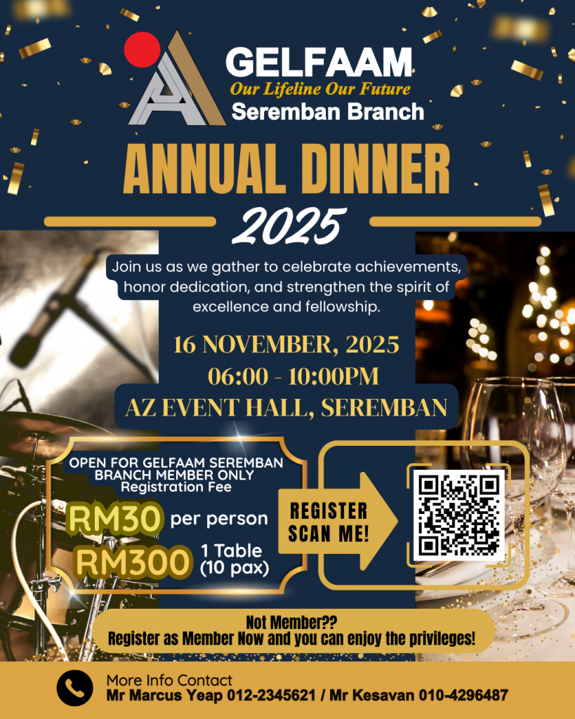 Posted on December 3, 2025December 3, 2025GELFAAM Ipoh Branch – Fellowship Dinner 2025 December 19 🔗Register Online Now🔗 📄Download Long Service Award Application Form📄