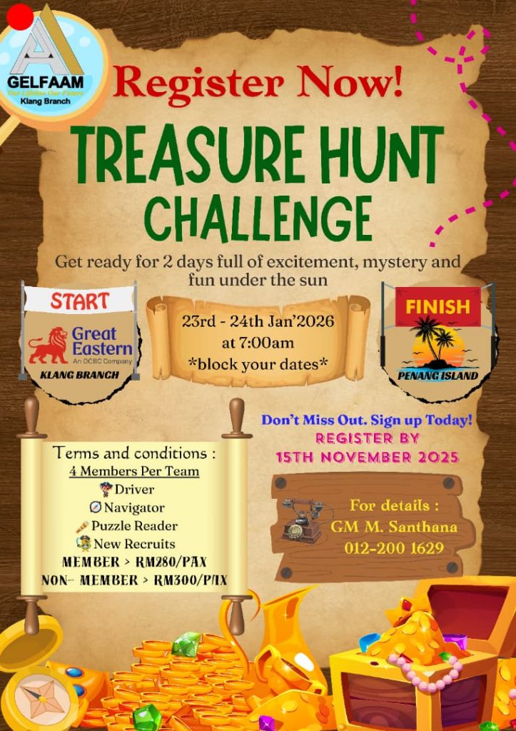 Posted on October 17, 2025GELFAAM Klang Branch – Treasure Hunt 2026 January 23-24 Excitement awaits on this inaugural GELFAAM Klang Branch Treasure Hunt Challenge from Klang to Penang! Register by 15th November 2025 to secure your team’s participation. Click Link to Register Now! Kindly transfer to GELFAAM KLANG BANK : MAYBANK ACC NO: 5623 9350 4758