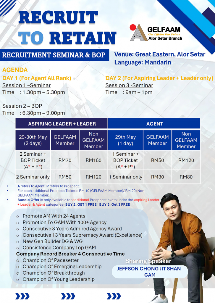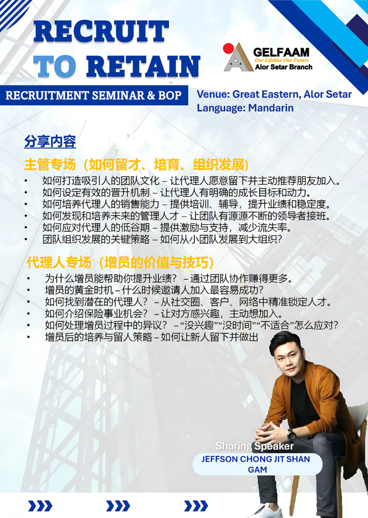 Posted on May 29, 2025May 30, 2025GELFAAM Alor Setar Branch – Mandarin Recruitment Seminar & BOP – Recruit to Retain 2025 May 29-30