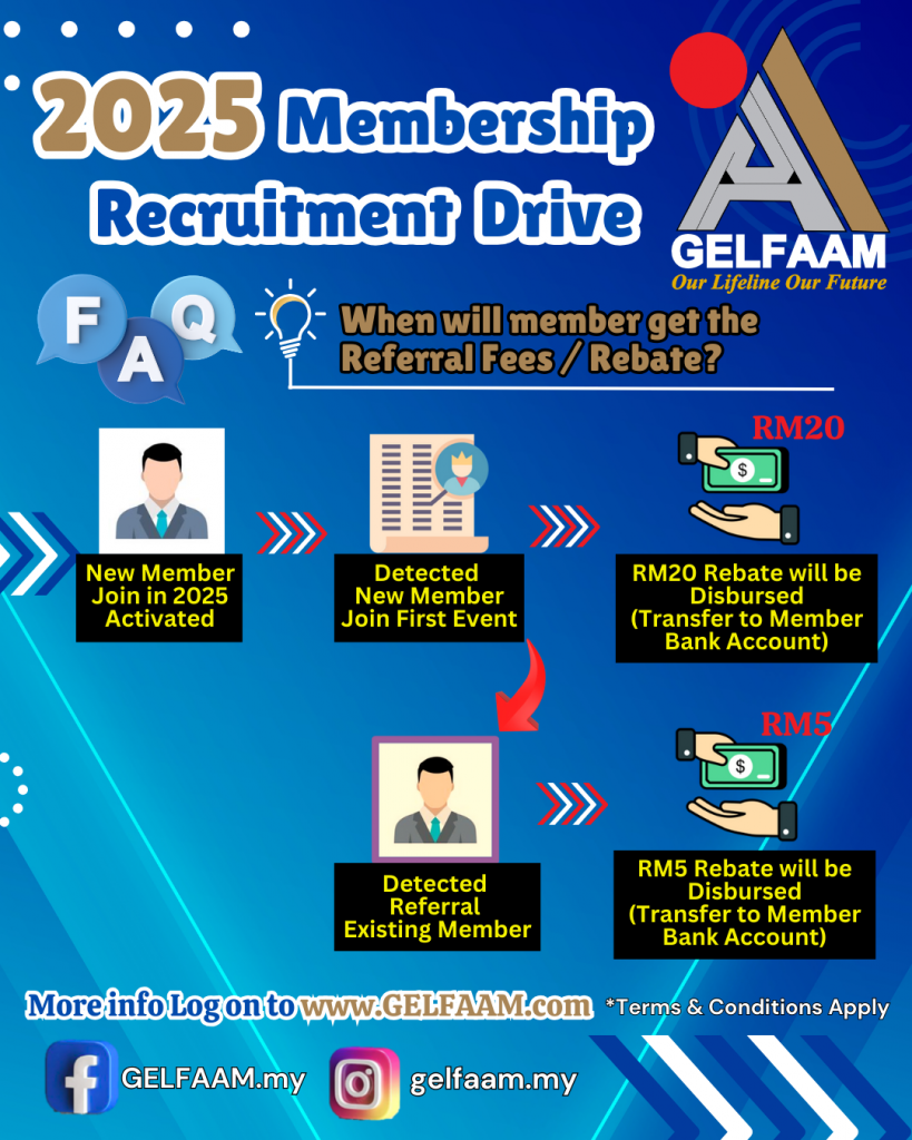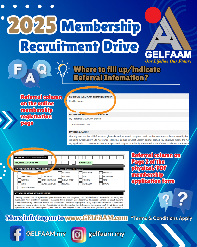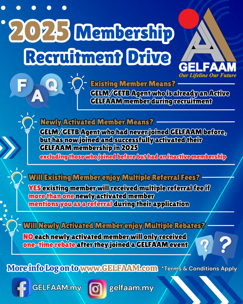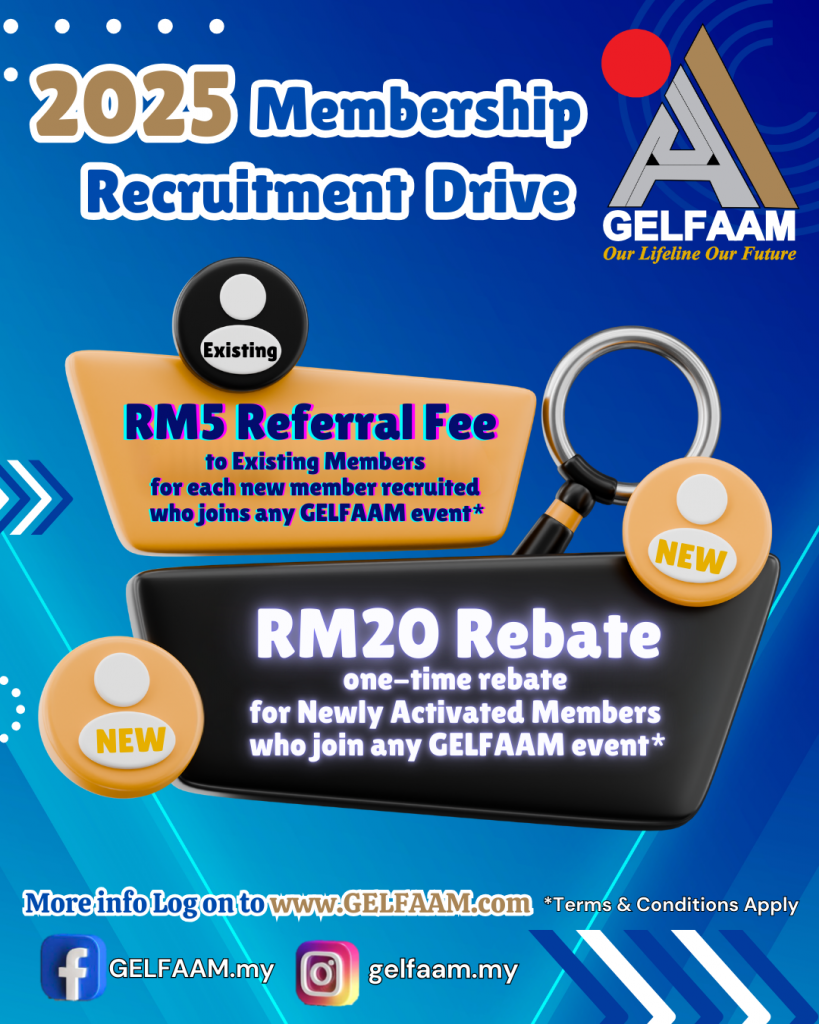 All active GELFAAM members are provided with a free world-wide & 24-hours RM10,000.00 personal accident insurance cover up to age 80. (Cover Accidental Death & TPD with RM5,000 funeral expenses – that is RM10,000.00 + RM5,000.00)